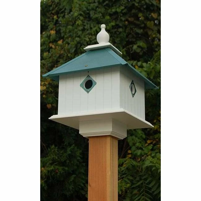 Establish a bird haven in your garden with this Wing and A Prayer Carriage Bird House with a Verdigris Roof. This classic home blends traditional styling with modern elements for a lasting abode. The home has four separate apartments, offering housing for several birds at once. Vertical lines on the exterior create the appearance of paneling on the sides for a realistic feel. A ledge around the base of the item lends fledglings takeoff or perching room, and the verdigris colored metal roof protects the abode from the elements. A large white finial tops the piece to complete the look. A verdigris colored metal predator guard surrounds each 1.5″ diameter entrance hole, preventing other birds from enlarging the hole and overtaking the house. Constructed of solid PVC trimboard, this house is designed not to mildew, mold, or delaminate with exposure to the elements, and will remain stable for up to 25 years. Use the preinstalled mounting collar to connect this home to a 4″ x 4″ post (not included), bringing height to the abode. The white color of the PVC contrasts the verdigris color on the roof, for a stylish roost. Invite several birds to live in your yard with this Carriage Bird House with Verdigris Roof. Made in the USA.