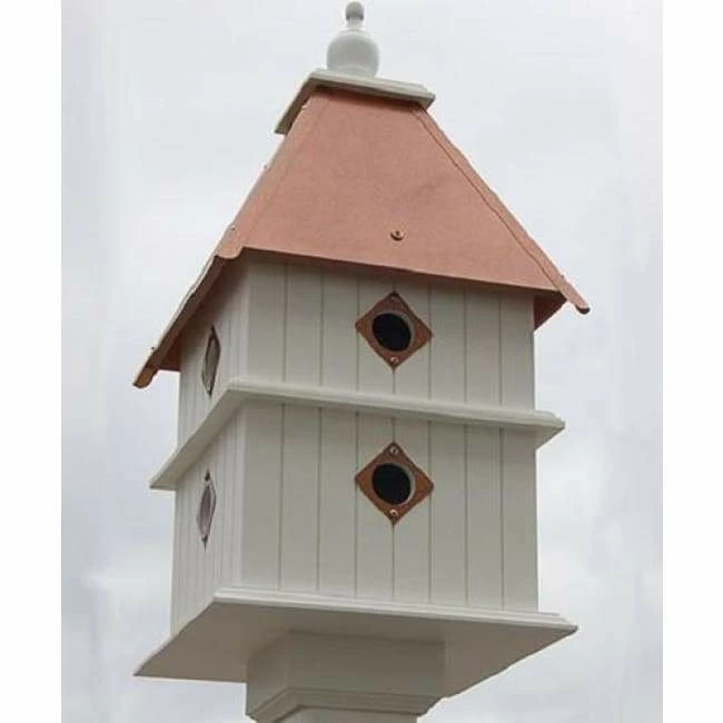 Invite a group of birds to establish a colony in your yard with the Wing and A Prayer Plantation Bird House. This dramatic home houses eight separate birds at once, for constant avian activity. Ledges around the base of each level help visually divide the home, as well as offer a perching or takeoff spot for fledglings. Vertical panels lend a classic design look to the house, and the white color adds a crisp feel. Each 1.5″ diameter entrance hole is surrounded with a metal predator guard, matching the copper color and finish of the roof for added dimension. A white finial tops the piece, adding height to the unit. Remove the roof and each floor in the house for seasonal cleanings and nest checks, to keep it usable for the next year. The hammered finish on the copper colored metal roof adds an elegant look to the unit. Constructed of solid PVC trimboard, this house is designed not to mildew, mold, or delaminate with exposure to the elements, and will remain stable for up to 25 years. Use the preinstalled mounting collar to connect this home to a 4″ x 4″ post (not included), bringing height to the abode. House several birds in your garden with this Plantation Bird House with Hammered Copper Roof. Made in the USA.