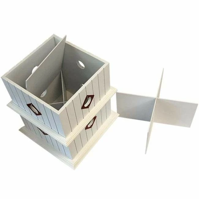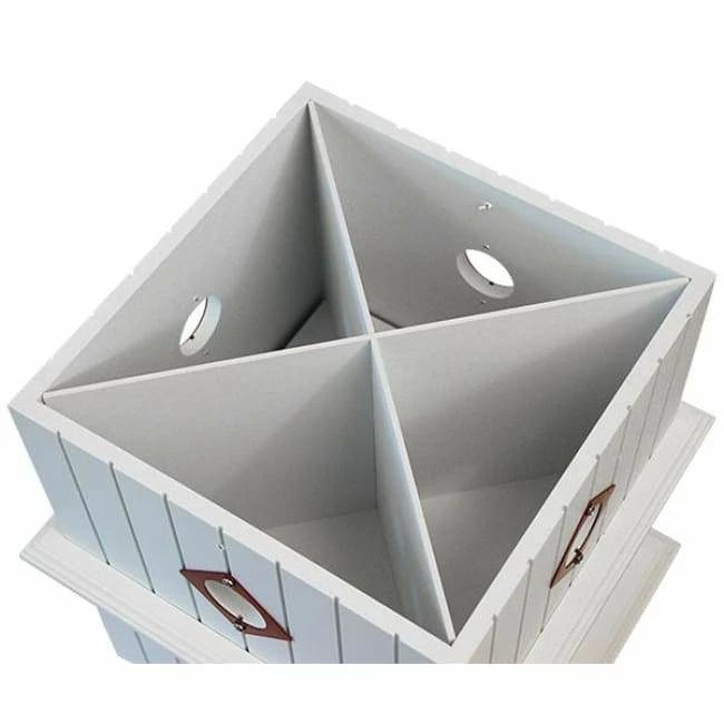 Invite a group of birds to establish a colony in your yard with the Wing and A Prayer Plantation Bird House with Merlot Red Roof. This dramatic unit houses eight separate bird families at once, for constant avian activity. Ledges around the base of each level help visually divide the home, as well as offer perching and takeoff spots for fledglings. Vertical lines throughout each side evoke beadboard for a classic look, and the white color adds a crisp feel. Each 1.5″ diameter entrance hole is surrounded with a metal predator guard, matching the deep red color of the roof for added dimension. A white finial tops the piece for height and more drama. Remove the roof and each floor in the house for seasonal cleanings and nest checks, to keep it usable for the next year. Constructed of solid PVC trimboard, this house is designed to withstand the elements and will not mildew, mold, or delaminate over time. Use the preinstalled mounting collar to display this home on a true 4″ x 4″ post (not included), for exciting height. House several birds in your garden with this Plantation Bird House with Merlot Red Roof. Made in the USA.