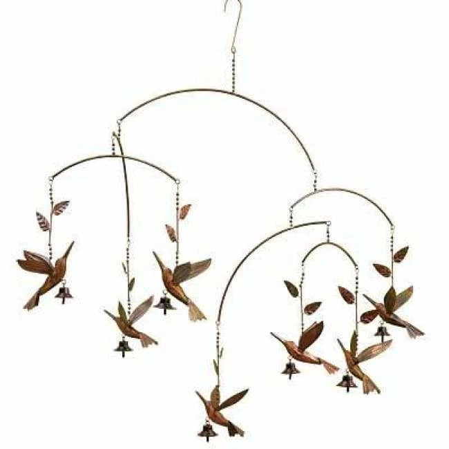 Bring soothing sound and adorable bird figures into your garden using this Ancient Graffiti Flamed Copper Colored Hanging Hummingbirds and Bells Mobile. The staggered arches, steel construction, and recognizable hummingbird shapes are sure to bring a bold look to your setting in moments. A top “S” hook makes it easy to place this adornment on a branch or hanger, and the three-dimensional hummingbird figures each culminate with a bell. Beaded chains hold the arch and bird shapes, enabling the item to move freely in the wind, and leaf figures above the birds celebrate trees. The varied brown tones on the unit enhance the natural appeal, while its steel construction provides durability. Enjoy delightful bird shapes and soft sounds in your garden with this Flamed Copper Colored Hanging Hummingbirds and Bells Mobile.