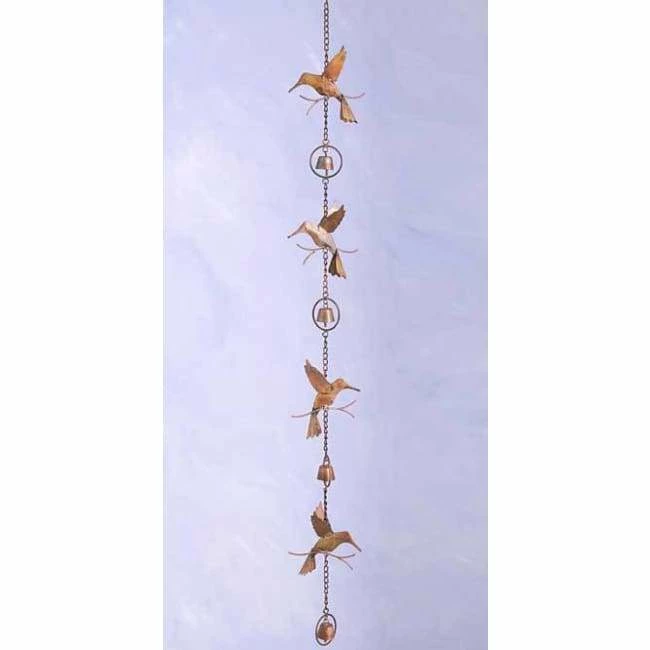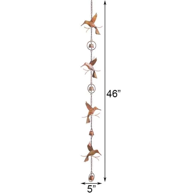 Enjoy seeing hummingbirds in your home or garden all year with this Ancient Graffiti Flamed Copper Colored Hummingbirds Decorative Hanging Chain. Each of the four, metal hummingbird figures on this chain has raised wings and a downward angled tail, creating the recognizable flight pose. A 2.25″ diameter ring with a bell sits between each bird shape, and chain links connect all the pieces together for a fantastic adornment. The bells ring gently in the wind, while the mottled brown tones create the flamed copper color on the piece. A generous, top hook makes it simple to hang this adornment, and its hardy, metal construction looks equally beautiful indoors or outside. Adorn part of your living space with remarkable hummingbirds using this Flamed Copper Colored Hummingbirds and Bells Decorative Hanging Chain.