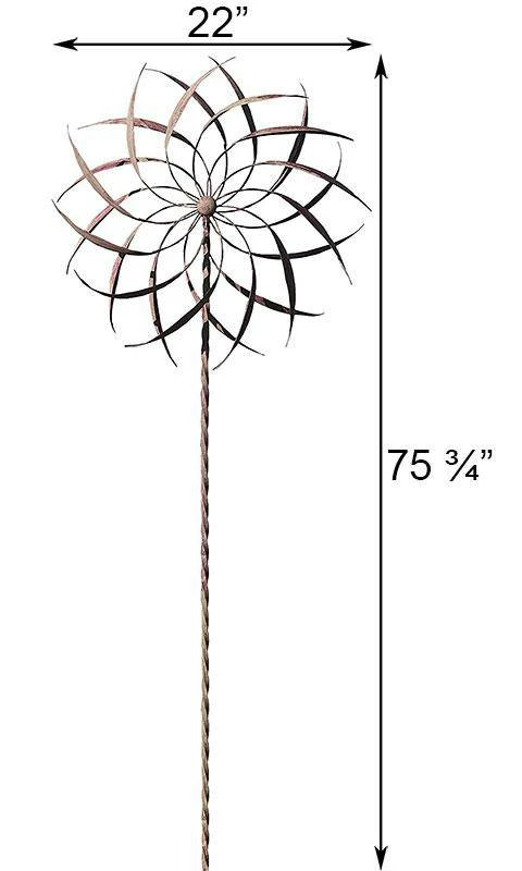 Celebrate wind power with a fantastic sculpture using the Ancient Graffiti Kinetic Pinwheel Spinner. The dual spiraling, starburst toppers bring a dramatic look to any setting, enhanced even more when they spin in a breeze. The curves on each arm help capture the wind, and the brown finish lends a natural feel to the item. These toppers attach to the included, 65.5″ tall shaft, with a twisted design along it to match the spinning action. Verdigris hints throughout this adornment bring an aged look to it, and the all steel construction ensures a durable and lovely piece. Its trident base and pointed legs help this shaft install into soil with ease, and keeps the spinner stable and secure in your garden. Bring moving artwork and wind power together in your backyard with this Kinetic Pinwheel Spinner. Assembly required.