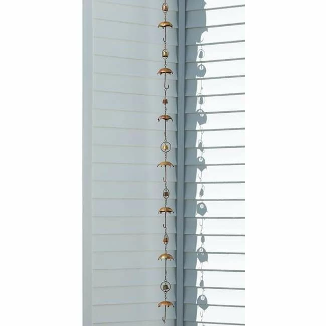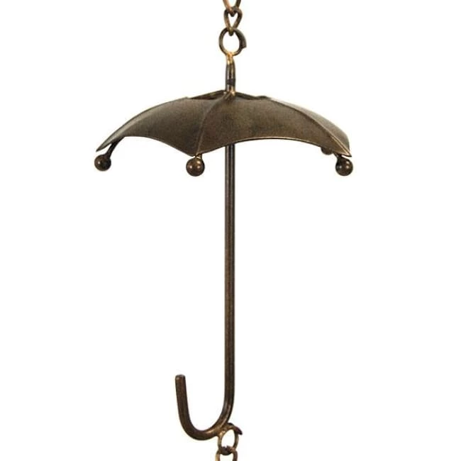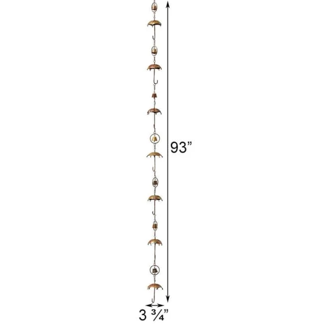 Celebrate rain in two fun ways using this Ancient Graffiti Umbrella and Bell Rain Chain. Hanging a rain chain from your gutter, rather than a downspout, brings style and personality to your home, and this unit will certainly lend whimsy and wonderful sound to your garden. Familiar, steel umbrella shapes create the lengthy body of this chain, bringing the rain theme to the forefront. A small bell inside a metal loop sits between each umbrella, and chain links connect each piece together for a cohesive unit. These bells ring gently as water moves down the chain, and the umbrella shapes direct the rain to the ground with ease. An included gutter clip makes it simple to install this item in place of a downspout, and the steel construction forms a lasting adornment. Place a rain barrel or other receptacle at the base of this chain to capture the rainwater, and use it to keep plants hydrated. The chain extends 93″ in length, and some links are removable to shorten the unit if needed. Showcase rain in a different and exciting way by placing this Umbrella and Bell Rain Chain on your home.