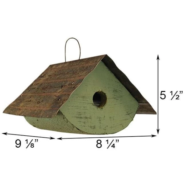 Add a green hint to your bird garden in several ways with this Bird In Hand Buck’s County Wren House. This rustic, hanging shelter is crafted from reclaimed wood and metal, adding an environmentally friendly look to the area, while its aged green tone enhances your landscaping. A significant, pitched metal roof and rounded base create the traditional shape of this home, while its extended length offers plenty of nesting area. A wooden front and back panel complete the item, and a 1.125″ diameter opening on the front allows small birds to access the shelter. The generous roof slightly overhangs the entry, keeping rain out of the unit, and drainage holes on the base allow any captured water to exit. Remove the metal plate on the back of the shelter to seasonally clean it using its 2″ diameter opening here. A metal wire on the top of the piece makes it simple to hang from a bracket or branch, and the aged green tone on the unit meshes with your garden. Its reclaimed wood and metal construction forms a durable abode, and reduces landfill waste for a fantastic garden addition. Offer wrens a new home with repurposed materials by adding this Buck’s County Wren House to your yard. Made in the USA.