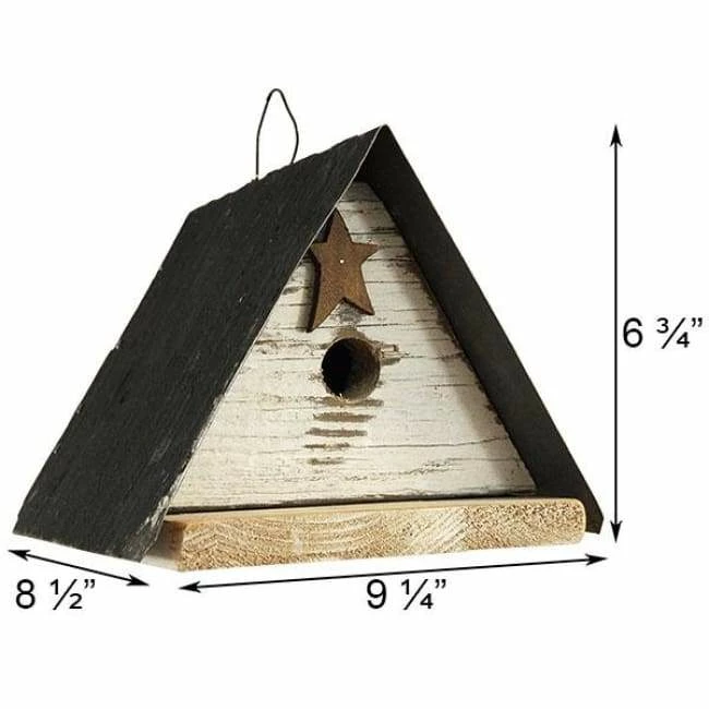 Provide small songbirds a welcome roosting spot by placing this Bird In Hand Friendsville Wren House in your garden. The generous, metal pitched roof lends a fun shape to your bird garden, while reclaimed wood forms the base and sides for a rustic addition to your yard. A 1.125″ diameter entrance hole rests on the triangular, front panel, topped by a wooden star for a fun hint. A gap at the top of this panel provides ventilation, and the extended base offers birds a place to perch. The overhang on the significant roof protects the interior from rain, and a hole on the base offers drainage. Swing the back, metal plate upward and use the 2″ diameter opening here to clean out the nest at the end of the season. Place this home on a branch or hook using its attached, top metal loop, so both you and your feathered friends may enjoy it. The reclaimed wood and metal construction forms a lasting and environmentally sound piece, while its white and brown tones mesh with your garden. Bring a cheerful abode into your yard with this Friendsville Wren House. Made in the USA.