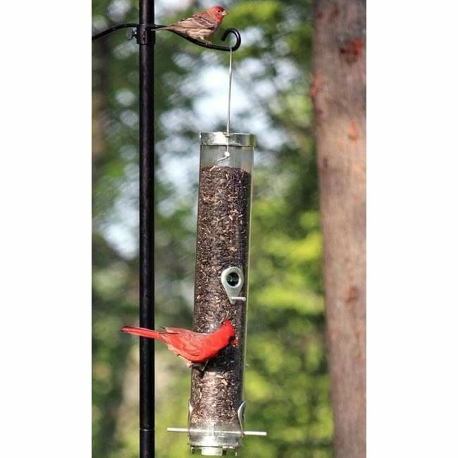 The Droll Yankees B-7F Bird Feeder features an exciting, versatile design that combines the classic tube feeder style with a high quality construction. Bring a little nature into your outdoor environment with this extra large bird feeder. Invite the birds in your habitat to feed comfortably from any of the six individual perches at the reinforced seed ports. The clear polycarbonate feeder tube keeps the seed level visible at all times and is perfect for holding 2.5 quarts of seed. An internal seed baffle design directs seed to the ports so that the feeder empties completely without leaving a dirty residue. Simply slide the die-cast metal cap up the hanger for quick, convenient cleaning and filling. The silver metal feeder base is equipped with drainage slots to keep seed dry and fresh. With its durable construction, the Droll Yankees B-7 Bird Feeder will faithfully serve the birds in your wildlife habitat, season after season. This feeder may be hung on the included metal loop hanger or pole mounted using any pole with a 3/4″ threaded adapter (not included). Some assembly required. Made in the USA. Lifetime Guarantee.