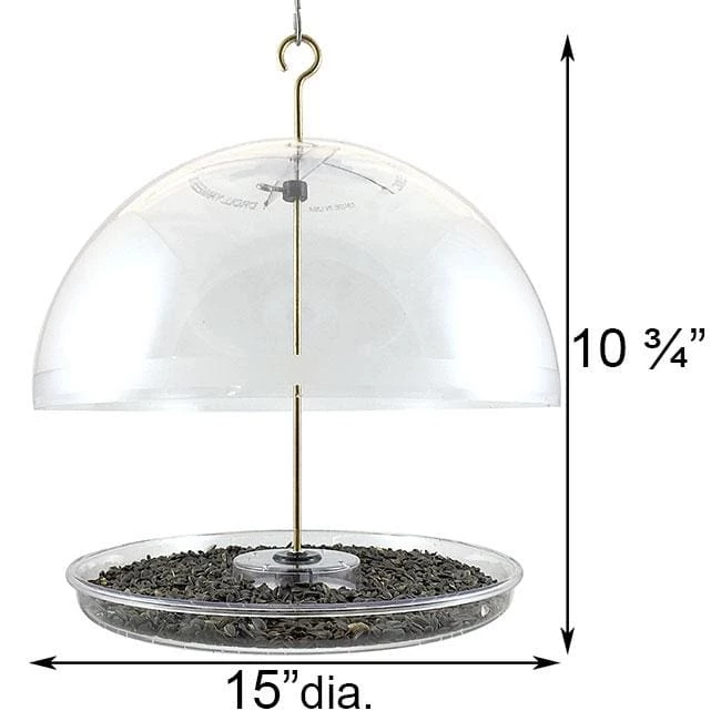 Dorothy’s Cardinal Feeder is perfect for songbirds. This feeder features a large 15″ dome that serves to protect the feeder tray from squirrels, undesirable birds, and the elements. The unique versatility of this feeder allows you to limit the access of undesirable squirrels and birds by adjusting the distance between the dome and feeder tray. Move the dome closer to the dish and the feeder becomes songbird selective. The 13″ diameter feeder tray is 1″ deep and will accommodate a virtually endless variety of bird foods including 0.75 quarts of seed, suet, and table scraps. Simply slide the feeder dome up the included hanging rod or unscrew the feeder tray for quick and easy cleaning and filling. The feeder dome and tray are clear plastic to keep the birds and the seed level visible at all times. This feeder may be hung with the included 10.75″ solid brass hanging rod or post mounted using any pole with a 0.75″ threaded adapter (not included). Made in the USA. Lifetime Guarantee.