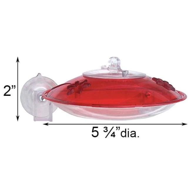 Enjoy hummingbirds dining near you with the Droll Yankees Window Hummer III. This versatile, steadfast feeder offers a wealth of features to help children become interested in birding, while forming a comfortable station for hummingbirds. The acrylic dish holds 6 ounces of nectar, and two flower shaped ports at the top allow birds to reach the feed. The cap’s red color helps attract hummingbirds, and a nectar recipe is engraved here for quick reference. Included nectar guards may be added to the two ports to keep insects from sullying the feed and preventing dilution from rain. The clear top cap unscrews for cleaning and refilling the unit, and the included port brush helps the ports remain unobstructed. Two heavy duty suction cups attach to your window, and the bar between them easily holds the feeder. These features have made this unit one of our favorite window options, and its durable, UV stabilized, acrylic construction is sure to last. Watch hummingbirds visit your home year after year to feed from this Window Hummer III. Made in the USA. Lifetime warranty.