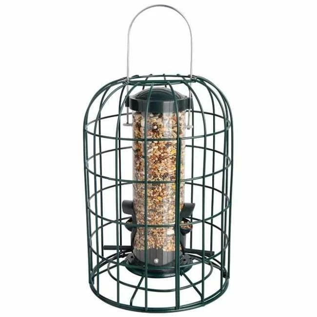 Create a feeding area just for small birds using the Esschert Design Caged Tube Bird Feeder. Covering a traditional feeder with a wire cage helps protect it from large birds, so smaller birds can dine undisturbed. The center, 2.625″ diameter tube holds 0.5 quarts of sunflower seed, safflower seed, or cracked corn, accessible via the two bottom ports. Twist the port openings 180° to feed thistle instead, offering a treat to different birds. A green metal cage surrounds this seed tube, and its 2″ long and 1.375″ wide openings allow only small birds to reach the unit. Place this feeder on a hook or bracket with the included metal hanger, for both you and your birds to enjoy it. When not suspended, the cage lifts easily from the feeder for thorough cleaning. The cap may also be lifted at this time to refill the piece, and the green color blends with your garden. Its plastic tube, ports and lid create a family-friendly unit, while the metal grid and hanger add durability. Keep your small songbirds fed with this Caged Tube Bird Feeder.