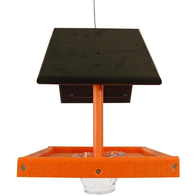 Accentuate your bird garden with bright color and different food offerings using this Polywood Black and Orange Recycled Plastic Single Oriole Feeder. The orange body and black roof of this hardy feeding station add a lively hint to your landscaping, while offering treats to select bird species. Designed and built by the Amish using recycled plastic milk jugs, this unit brings an environmentally sound look to your yard while holding fruit, jelly, suet nuggets, or seed for your feathered friends. A black, pitched roof covers the vertical support, and two stakes on this piece hold orange pieces with ease. The semicircular cutout beneath the stake creates clinging spots for birds, and provides room for the included, plastic cup. This cup holds 5 ounces of jelly, seed, mealworms, or nectar, offering an extra treat to different bird species. The vessel removes easily for cleaning and thorough refilling, and the square base completes the piece. Place the unit on a hook or bracket using its included hanger, for a straightforward display, allowing its finish to add a pop of color to your landscaping. Provide orioles, robins, and bluebirds their favorite treats in this Polywood Black and Orange Recycled Plastic Single Oriole Feeder. Made in the USA.