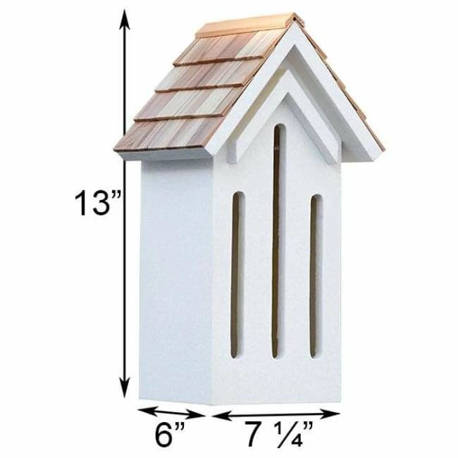 Offer beautiful butterflies shelter in your garden using the Prime Retreat Classic White Butterfly House. Many of these captivating insects hibernate through the cold winter months, and also require a refuge during summer rainstorms. Providing this home creates a place for butterflies to hide from predators, stay dry, and rest. The front panel of this shelter has three elongated slots, mimicking crevices in wood piles or bark that butterflies often use for protection. A pitched roof covers the roost, with cedar shakes on it for added design. A hanging tab on the back of the unit enables it to be placed on a post or against a wall, while the flat base allows it to attach to a pole with a mounting bracket (not included). The back panel removes from the home, for you to place twigs and leaves in it for added shelter. The crisp white paint enhances any setting, and the wooden construction creates a safe haven. Invite butterflies into your yard with this Classic White Butterfly House.