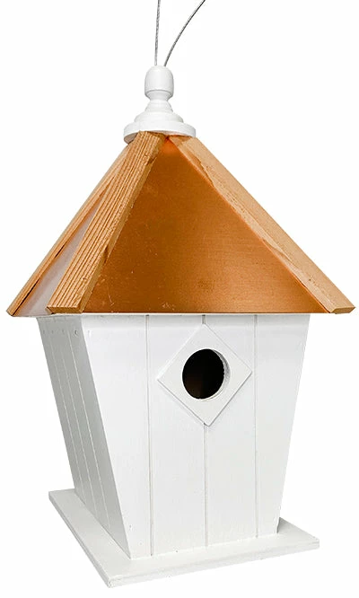 Provide a serene shelter for chickadees or wrens by adding this Home Bazaar Paxton Hanging Bird House with Copper Roof to your yard. The crisp colors of this nesting box bring a bit of the eastern seaboard to your setting, while its classic shape provides a fantastic home for small songbirds. Routed, vertical lines enhance the tapered shape of the abode, which sits on a generous, rectangular platform. Copper panels and cedar tines on the hipped roof add shine and contrast, while a white, wooden finial completes this piece. Songbirds can enter the roost through the 1.25″ diameter opening, which sits high on the front panel, surrounded by a diamond shaped piece of wood for added interest and definition. Ventilation holes beneath the roof overhang prevent nestlings from overheating, and a drainage hole on the base allows any captured rain to escape the home. Remove the back panel to monitor your birds and for in depth cleaning and maintenance. A top, plastic coated cable makes hanging the item in a tree or on a hook simple, or the level base may be pole mounted with an adapter (not included) for a different display. The white, wooden body adds traditional tones to your yard, and the copper covered roof provides durability and distinction. Create a refuge for small songbirds by adding this Paxton Hanging Bird House with Copper Roof to your landscaping.