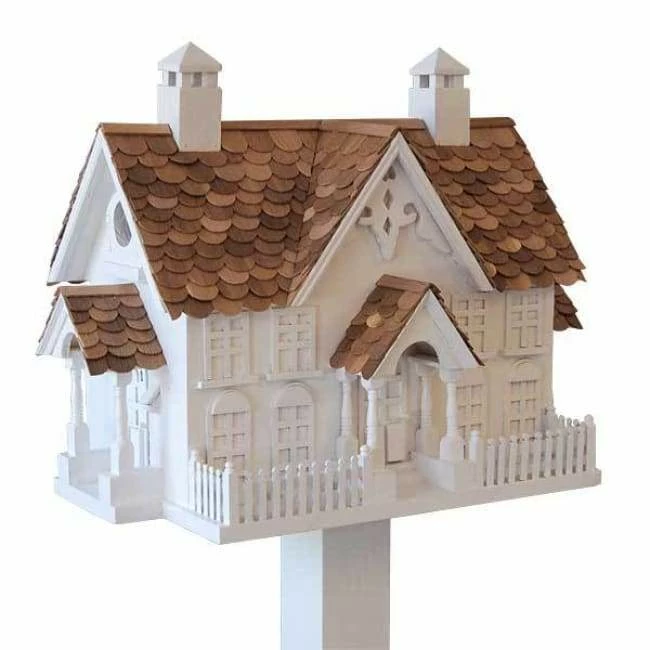 Add a palatial roosting spot for two avian families to your yard with this Home Bazaar White Wrension Bird House. The generous size and realistic detailing on this shelter bring an ornate look to your bird garden, while its white and brown color scheme offers a timeless hint. Raised frames along the face of this unit evoke windows on a two story building, and porticoes highlight each of the door shapes. A classic, picket fence along the front of the piece furthers the realistic look, and rounded wooden shingles on the pitched roof complete the item. A 1.25″ diameter entry hole sits above the doors on each end of the shelter, offering passage to small songbirds. The divided interior enables two bird families to roost at once, and the back panel removes for seasonal nest checks. Each roost remains dry thanks to drainage holes on the base and the roof overhang, and a ventilation gap along the back of the shelter aids in regulating the internal temperature. Fledglings can use the screening beneath the entry holes to reach them when ready to fly, or can rest on the porch crests beneath the openings. The extended, flat base allows you to place this shelter on a post easily, or the unit can be displayed in your home for a different effect. Its white body and brown roof are sure to add style to any setting, and the wooden construction celebrates nature. Create an opulent roosting spot for birds by adding this White Wrension Bird House to your yard.