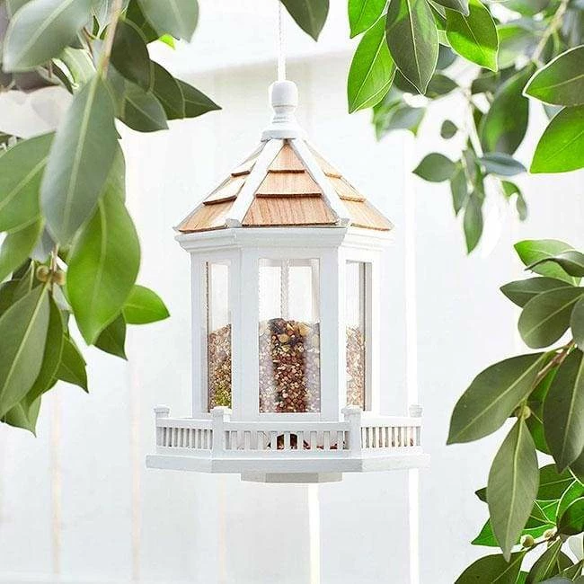 Offer birds a charming place to rest and dine with the Home Bazaar Gazebo Bird Feeder. Crisp white railings around the base of the feeder and white rafters on the roof contrast the natural color of the wooden shingles for a delightful and understated feeder. The hexagonal base offers plenty of room for a few birds to perch and dine at once, and the six seed ports allow it to easily empty from the reservoir. Clear plastic panels form the hexagonal seed tube, which can hold up to 1 quart of mixed seed. The attached nylon cord allows the feeder to be hung, and two wooden pegs underneath the roof keep it secure when hanging. Lift this roof upward to easily refill the item. The wooden construction adds a natural feel, for a wonderful addition to your garden. Feed birds with ease using this Gazebo Bird Feeder.
