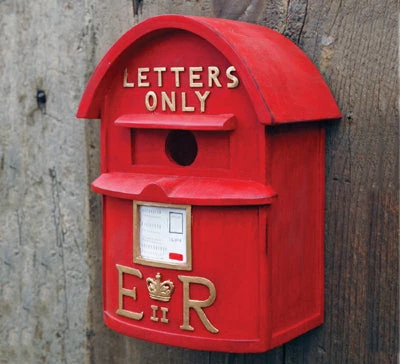 English Postbox Birdhouse. Just like English red postboxes, this birdhouse carries the Royal Cipher of Queen Elizabeth II. Frost resistant poly resin birdhouses add a touch of whimsy to your garden and provide homes for nesting birds.