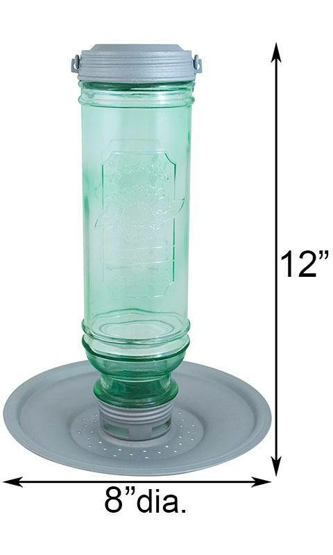 Create an antique motif in your bird garden using the More Birds Vintage Bottle Bird Feeder. A center, glass reservoir with a soft green hue will certainly attract the eye, while the gray, metal cap and tray make it a wonderful and durable feeding spot. This reservoir holds 1.1 quarts of sunflower seed or mixed seed easily, while an embossed logo on the bottle furthers the classic motif. The neck of this bottle remains secured to the 8″ diameter, metal tray, and four openings on the bottom collar allow seed to exit onto the tray for your birds to enjoy. Drainage holes around the seed openings help the feed remain fresh and dry, and the slight bowl shape with a raised lip provides plenty of perching room. A matching, gray metal cap covers the reservoir, and this may be unscrewed for cleaning or refilling the unit. The metal loop here enables the feeder to hang from a bracket easily, and the gray and green tones create a perfect contrast. Add a timeless bit of style to your backyard with this Vintage Bottle Bird Feeder.
