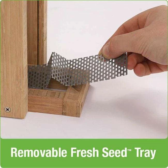 Highlight your love of aquatic style with this Nature’s Way Bamboo Vertical Wave Hopper Bird Feeder. Slightly curved, upright bamboo panels create the undulating body of this feeder, bringing unique shape and style to your landscaping with ease. A rectangular base with metal tray and vertical plastic side panels completes the reservoir, accommodating 1.3 quarts of safflower, sunflower, or mixed seed. Four metal ports rest on the upright sides, and perches here create comfortable dining spots for larger birds. Additional seed exits the chamber via gaps, sitting on the perforated metal tray for even more dining spots. A ridge in the center of this metal panel creates a seed diverter, reducing build-up in the reservoir, and its screened material allows water to drain. The black, pitched and lapped roof further protects food from the elements, and slides up the attached, vinyl coated cable for easy cleaning and refilling. The bamboo construction of the shapely frame is naturally resistant to insects, bacteria, and squirrel damage, and the plant is quick to regrow and simple to harvest for a truly sustainable material. Beckon birds into your garden with this Bamboo Vertical Wave Hopper Bird Feeder. Ten year warranty.