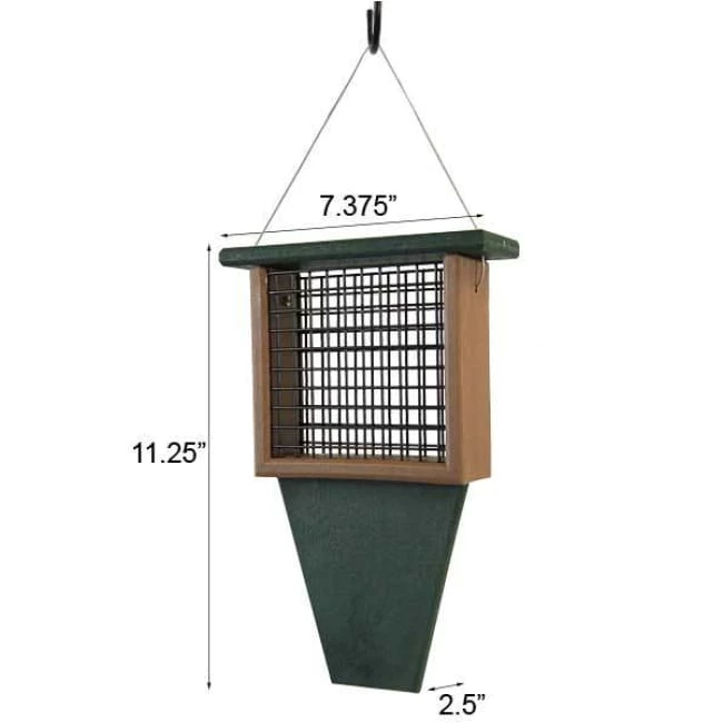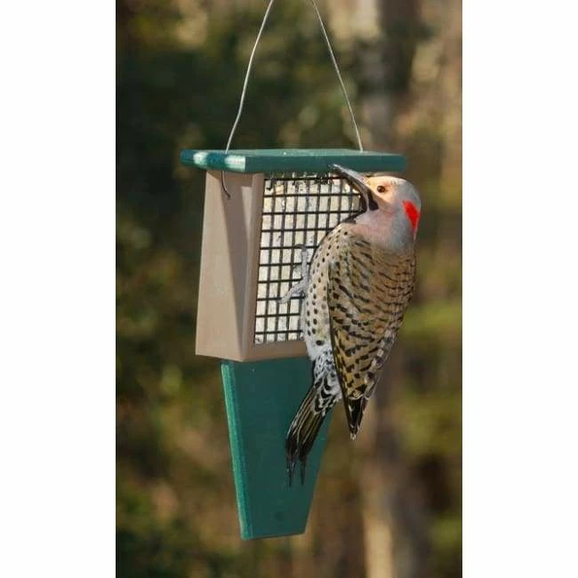 Create a lasting suet feeding station in your yard using the Songbird Essentials Green and Brown Suet Feeder with Tail Prop. Placing a suet feeder in your garden can attract birds that traditionally do not use seed feeders, such as orioles and mockingbirds, for a fun and busy bird garden. The sturdy, soft brown frame of this piece is crafted from recycled plastic, for an environmentally friendly and lasting unit. Its center accommodates one standard suet cake, and the 0.5″ square mesh here allows birds to easily reach the treat. The unique frame allows birds to cling and dine, and the dark green prop at the base helps woodpeckers keep their balance while eating. A green plastic lid covers the suet, and lifts up the attached steel cable for refilling or cleaning. The durable, recycled plastic frame will not fade, peel, crack, rot, or warp, for a feeder you can enjoy for many seasons, and its natural color scheme enhances your lawn. Hang this item in a tree or on a hook for a fantastic and busy bird garden. Offer suet to many birds using this Green and Brown Suet Feeder with Tail Prop. Lifetime guarantee.