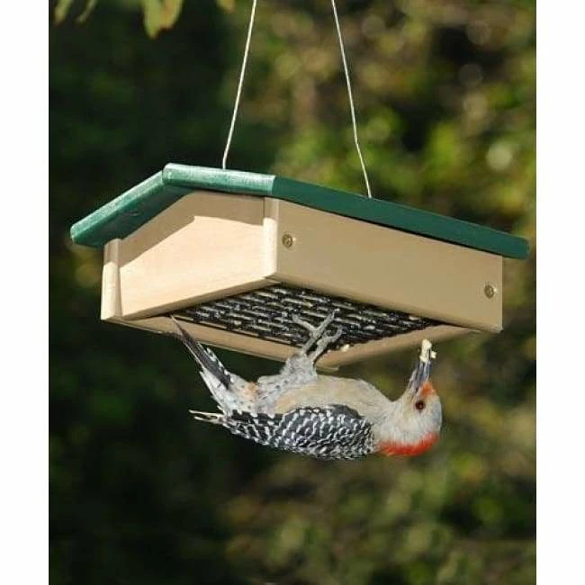 Offer suet to woodpeckers, chickadees, and nuthatches in an environmentally sound way using the Songbird Essentials Green and Brown Upside-Down Suet Feeder. The unique, inverted design of this item inhibits larger, non clinging birds such as starlings and blue jays from raiding it, for a station your small birds are sure to enjoy. A large, recycled plastic roof protects the reservoir underneath it, which easily holds a standard suet or seed cake. A durable frame of this same material offers strength and stability to the item, while coated wire fencing on the base supports the suet cake. The 1″ x 0.5″ openings here allow clinging birds to dine, and the piece is simple to clean and disinfect. Crafted from recycled plastic, this feeder will certainly last year after year, while diminishing landfill waste. The brown and green color scheme blends with your landscaping, and an attached steel cable makes hanging the item simple. Add a fun feeder to your bird garden with this Green and Brown Upside-Down Suet Feeder. Lifetime guarantee.