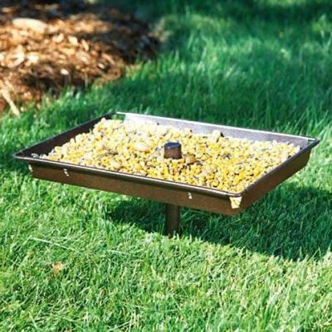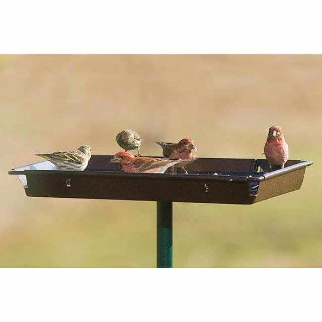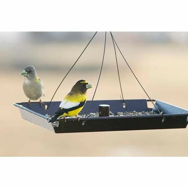 Create a versatile feeding station in your sanctuary with the Stokes Three in One Platform Feeder. The open design of this feeder allows all types of birds to feed comfortably whether the feeder is hanging, placed near the ground, or mounted on top of a pole. A flock of your backyard birds will feed at once from the generous 15.25″ by 11.25″ feeding platform. Offer mealworms, fruit, nuts, or suet to attract specific birds, or attract all birds by offering combinations of these and seed. The metal base will hold up to 3 quarts of anything you wish to feed. The screen base of the metal tray provides excellent drainage, helping keep feed dry and fresh, and the included cover grid can be removed if desired. This allows the platform to work as a squirrel feeder, or feed larger birds. The open design makes cleaning or refilling this item quick and convenient. This feeder is crafted from metal and finished in a speckled bronze tone, for an elegant feel. Hang this feeder from a hook or bracket using the included metal hanger, or pole mount it near ground level with the included ground stake. A built-in socket accommodates poles 1″ in diameter, enabling the item to be pole mounted (pole not included). Offer a variety of dining options in your birding sanctuary with this Three in One Platform Feeder.