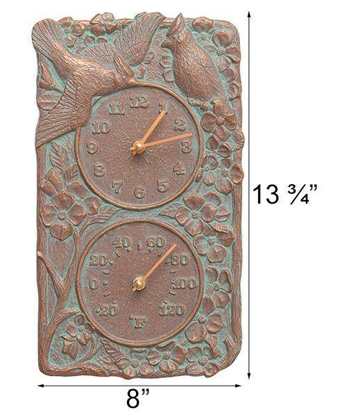 Add avian antics to your outdoor wall using the Whitehall Cardinal Clock and Thermometer. Three-dimensional cardinal, flower, and branch shapes form the detailed frame on this piece, lending a natural look to your patio or deck. One of the cardinals appears in flight, while the other seems to rest within the branches. Two circles occupy the center of this rectangular unit, the top one an analog clock and the bottom one creating a thermometer. The clock runs on a single, AA battery (included), and the -20° to 120° Fahrenheit temperature range allows the thermometer to measure both cold winters and hot summers. Crafted from durable aluminum, the item will easily withstand use outdoors for a fantastic garden addition. Its copper background color enhances the nature scene on it, while verdigris hues within many of the depressions and crevices add contrast. Attach this unit to your wall with its included mounting hook, so you can obtain both the time and temperature at a glance. Enjoy cardinals in your living space while monitoring the weather and time with this Cardinal Clock and Thermometer. Made in the USA.