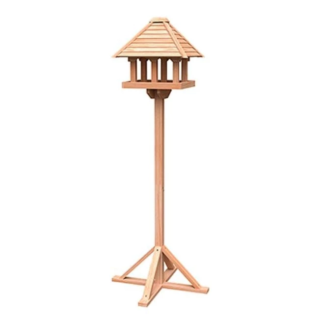 Welcome birds into a section of your yard with this Woodlink Wild Bird Lovers Cedar Gazebo Bird Table with Stand. This convenient, free-standing feeder enables you to keep a bevy of birds well-fed, while the cedar construction forms a lasting station. A generous, rectangular platform holds 1.7 quarts of mixed seed, fruit, suet, or other avian treats, and a lapped roof fully covers this section to protect the seed from rain. Three vertical supports and arch accents affix to two sides of this platform, holding the roof and adding an architectural feel to the unit. The bottom of the tray easily attaches to the included, 45″ tall stand, and a cross bar base with diagonal supports keeps the station stable. The cedar body is naturally resistant to insects and rot, and the open design of this piece enables several birds to dine at once. Provide many types of food to the birds in your area in this Wild Bird Lovers Cedar Gazebo Bird Table with Stand. Assembly required.