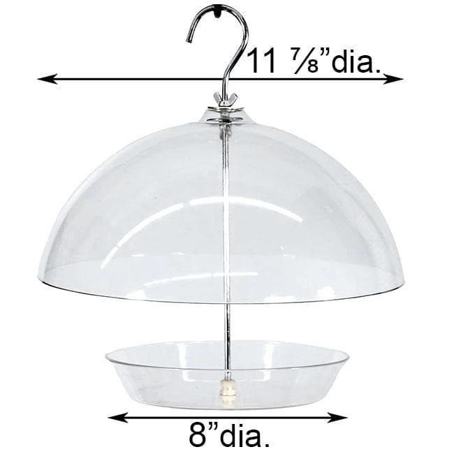 Offer bluebirds some of their favorite foods using the Audubon Domed Wild Bird Feeder. This unique station offers the versatility of a tray feeder, while remaining covered by the top dome. This 11.875″ diameter, clear plastic dome may be raised and lowered along the center metal rod, limiting access to the feed by larger birds or squirrels. The 8″ diameter base tray accommodates up to 1 quart of seed, mealworms, fruit, or even suet. Its clear plastic body keeps birds and feed levels visible, and small holes on the base of the tray help the seed stay dry and fresh. This generous dome further protects food from the elements, and easily moves up the threaded metal rod for cleaning and refilling the item. A significant hook at the top of the rod enables the feeder to hang from a branch or bracket with ease, and the heavy-duty, polycarbonate body will withstand the elements. Invite a wealth of different birds to your yard with this Domed Wild Bird Feeder.