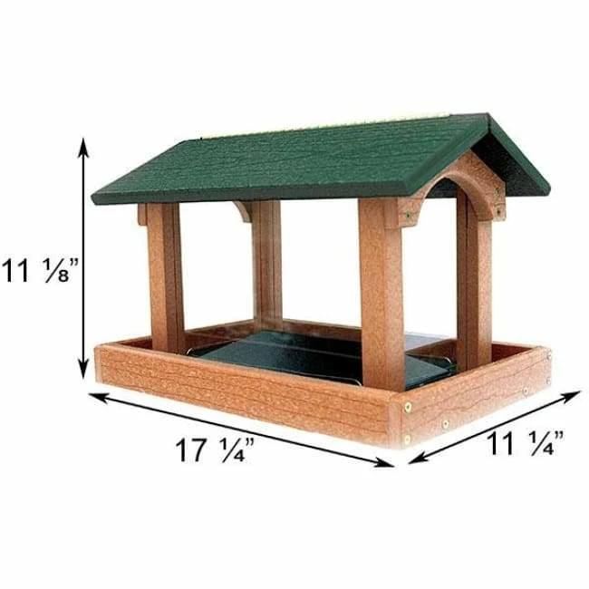 Feed an entire flock of birds at once from the Woodlink Recycled Plastic Premier Hopper Bird Feeder. This generous and environmentally sound feeder is loaded with features birds love. The large reservoir holds 8.8 quarts of seed, and offers feeding room on each side. The extended sides and raised lip on the platform enable several birds to perch at once. A green, powder coated screen base allows water to escape the seed, keeping it dry, and a large baffle in the bottom of the reservoir prevents a dirty residue from forming. The four plastic panels keep seed levels visible, and the significant roof protects the unit from rain. The feeder is made from 90% recycled plastic, minimizing the plastic in landfills, and the hinged roof enables quick cleaning and refilling. This sturdy construction does not absorb any moisture, and thus will not harbor bacteria or mold, and also will not crack, peel, or rot. Use a mounting bracket (not included) to pole or post mount this feeder. Offer several birds a feeding station in your yard with this Recycled Plastic Premier Hopper Bird Feeder. Made in the USA.